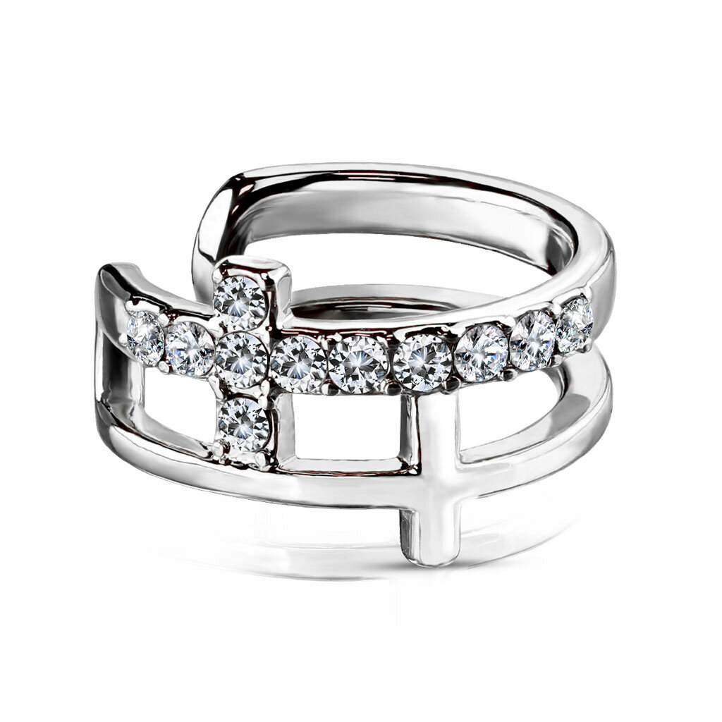 クリスタルを並べた十字架とプレーンな十字架2つをつなげた大人のイヤーカフ。