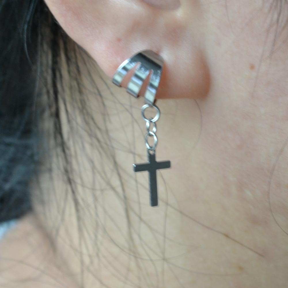 3連風のシンプルなステンレス製のノンホールタイプのイヤーカフにステンレス製のフラットで平らな十字架チャームが揺れるシンプルでおしゃれなイヤリング。