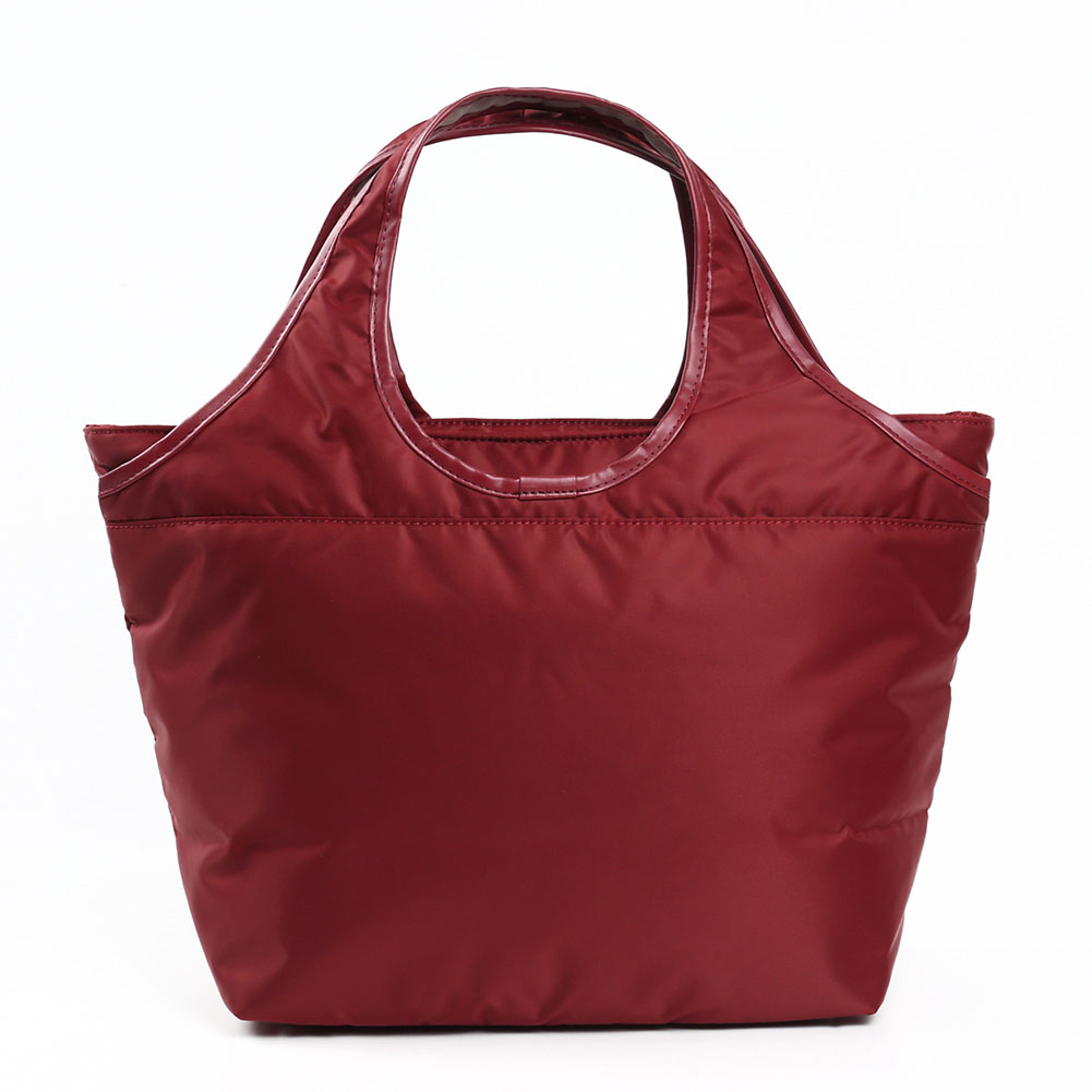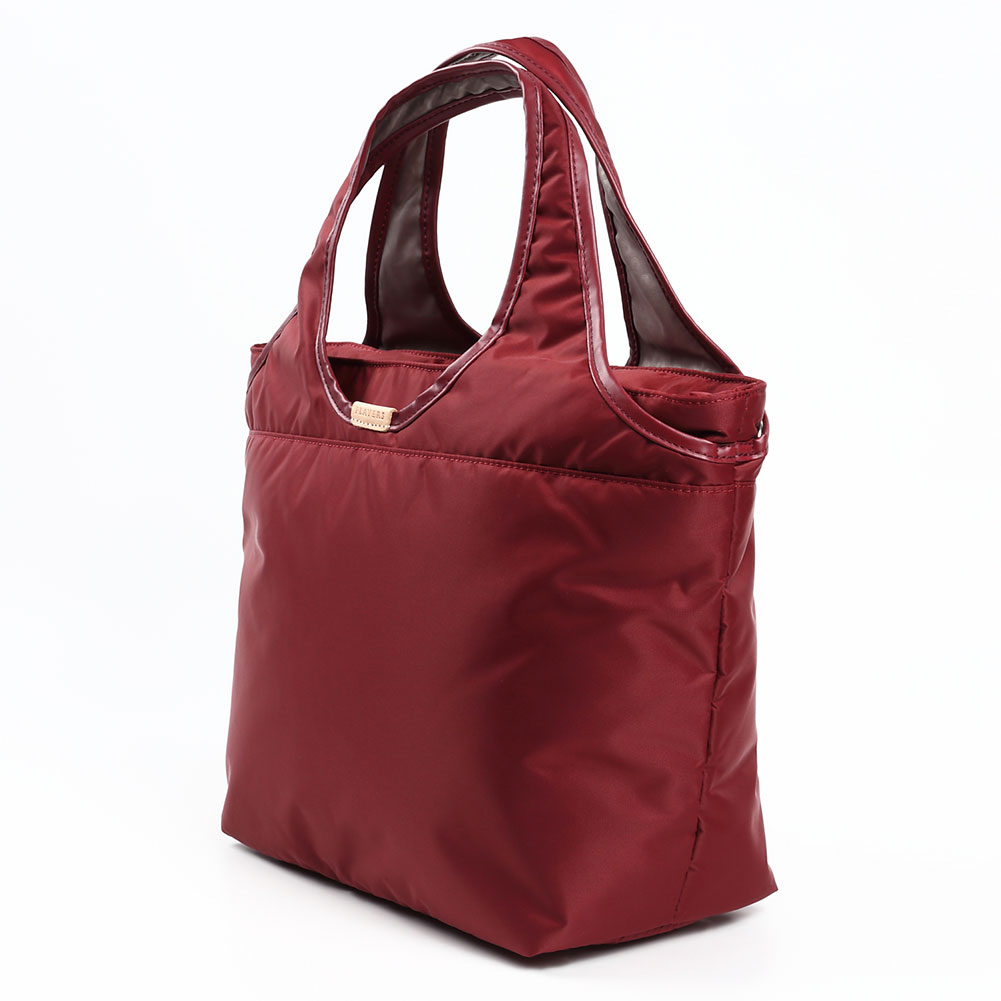 光沢感のあるナイロンのツイル生地や、持ち手周りの合皮、底鋲が、大人の雰囲気のバッグです。